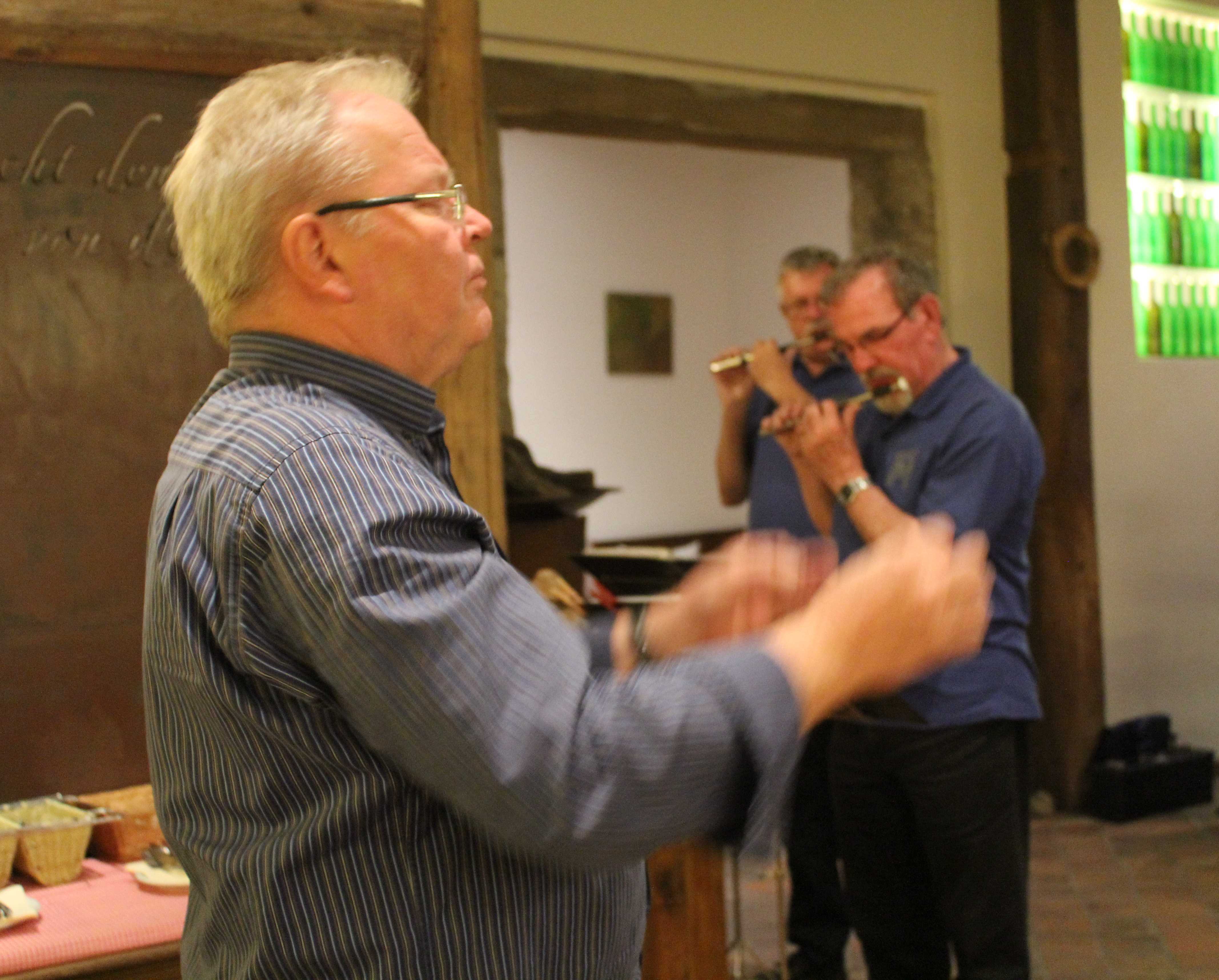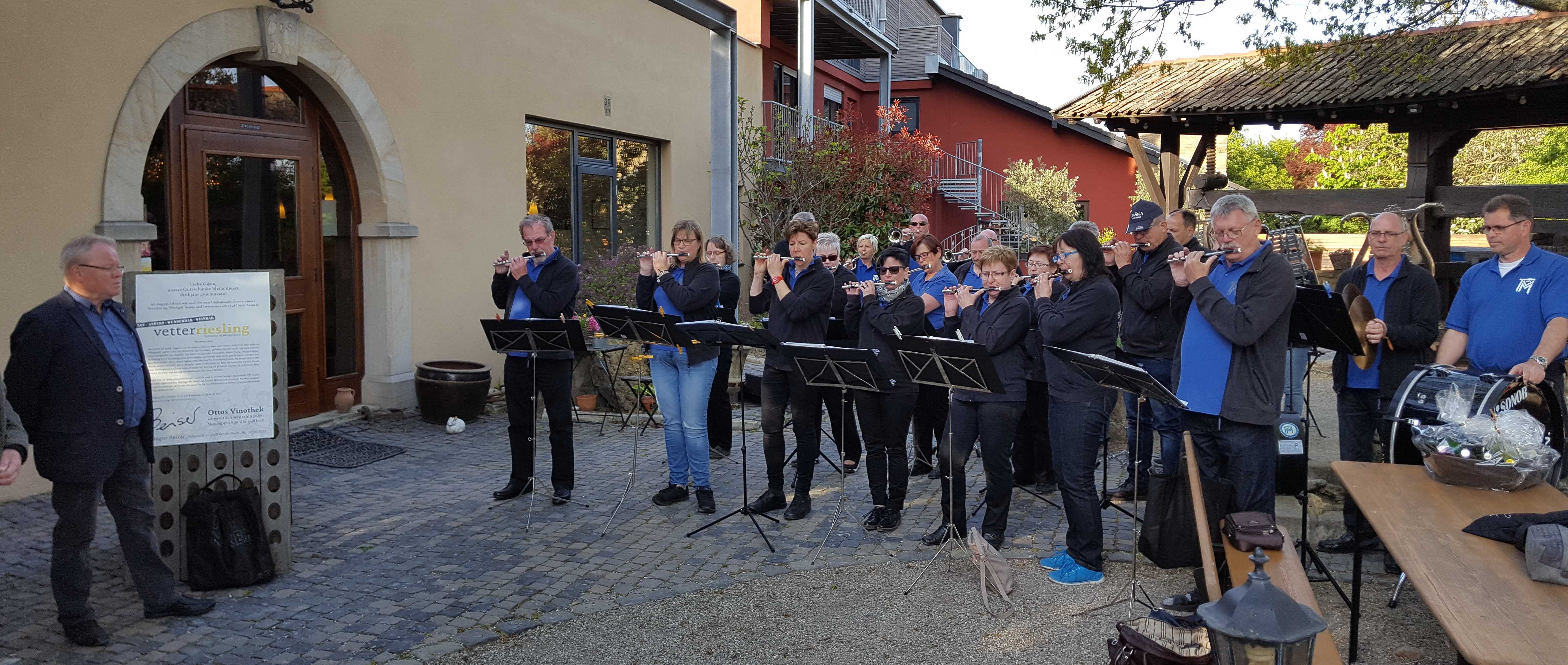 Im Weinhaus Beiser in Vendersheim spielten wir am Abend auf und feierten nicht nur unseren bestens aufgelegten Dirigenten, sondern auch ein Silberpaar aus den eigenen Reihen. Die beiden hatten es sich nicht nehmen lassen, trotz ihres Hochzeittages beim Besuch bei Walter dabei zu sein. Es wurde ein schöner Abend mit viel Musik, Wein und guter Laune.