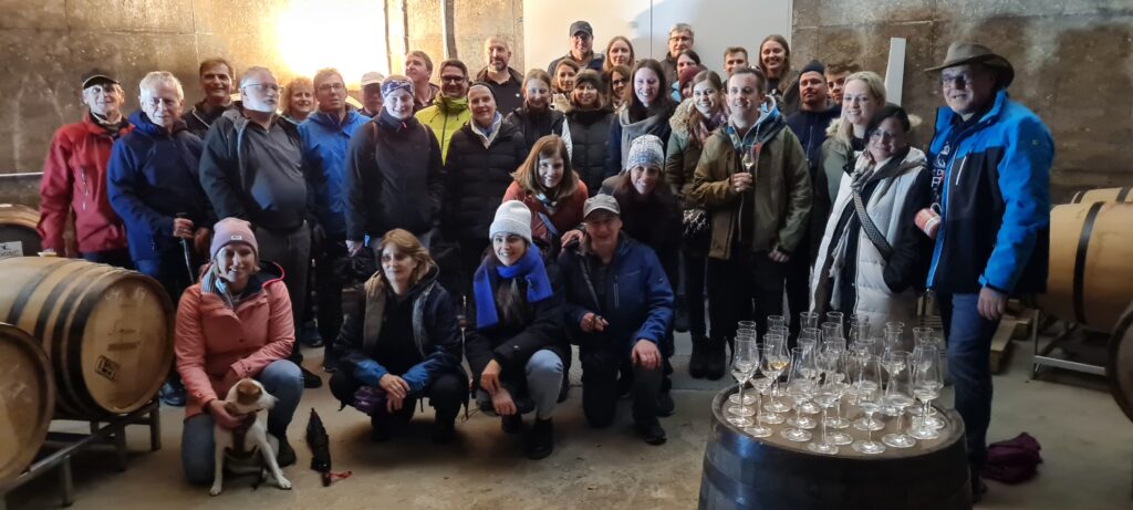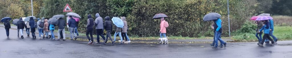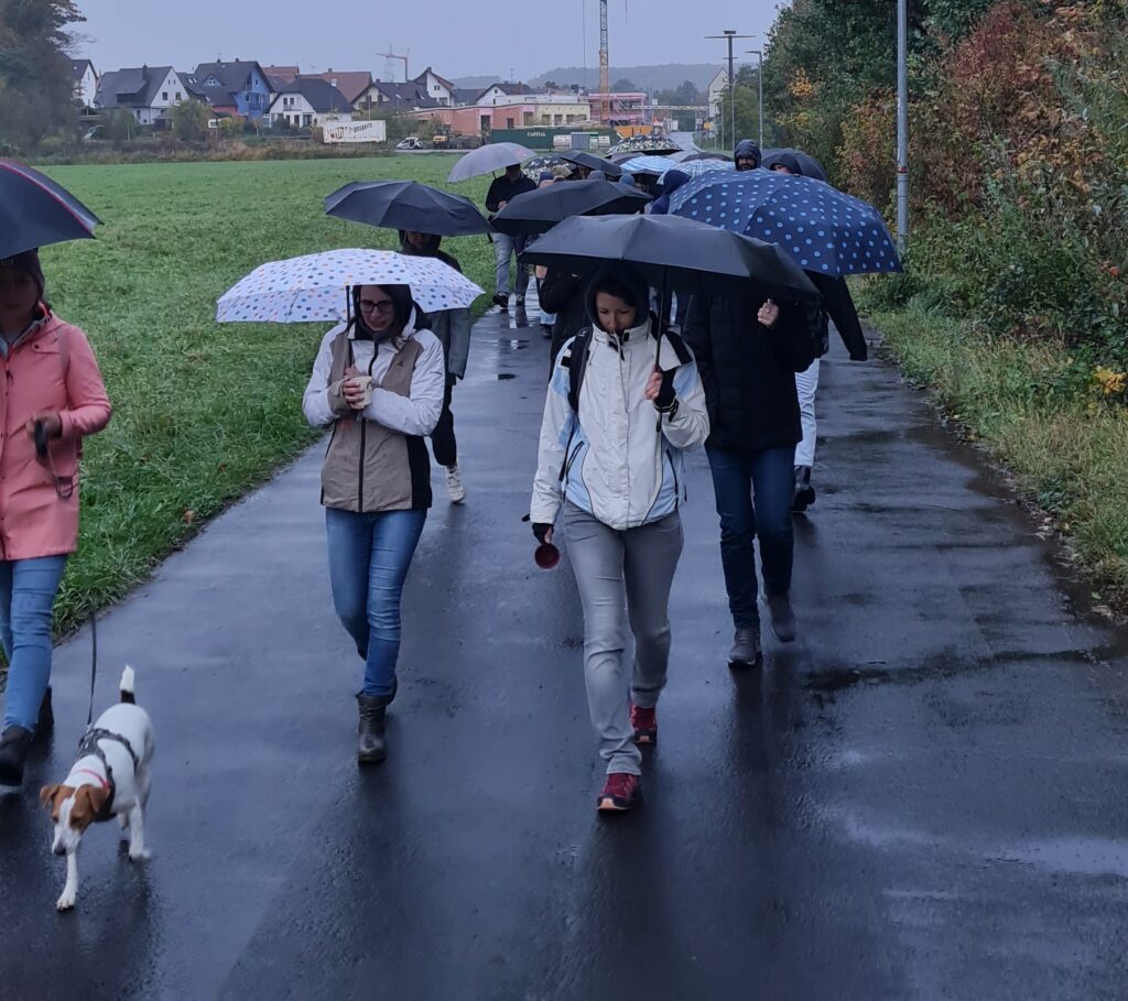 Wir starteten um 15 Uhr am Bahnhof in Michelbach, wo wir zuerst mit heißem Glühwein, Punsch und Lebkuchen verwöhnt wurden. Im Anschluss starteten wir unseren ersten Teil der Wanderung, der leider von Regen und Sturm geprägt wurde. Doch davon ließen sich die Teilnehmenden die Stimmung nicht trüben.