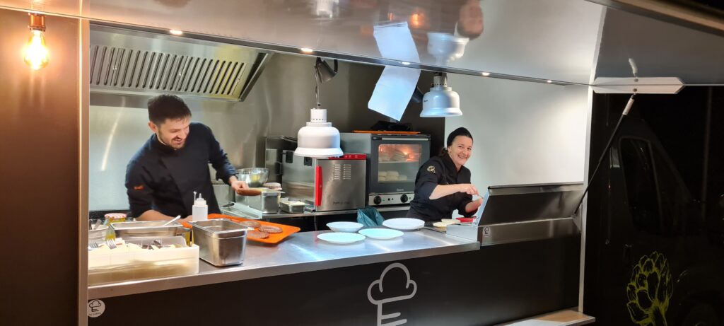 Aufgewärmt, von innen und von außen, ging unsere gesellige Wanderung weiter. Über den Weinberg liefen wir zum TV Heim, an dem schon Eder`s Food Truck auf uns wartete. Die Wartezeit bis zum Essen verging durch die vielen schönen Unterhaltungen dann auch rasant. Gewählt werden konnte zwischen Burgern, Risotto und Pasta. Alles schmeckte wunderbar und so konnten wir den gemeinsame Abend satt und zufrieden ausklingen lassen.