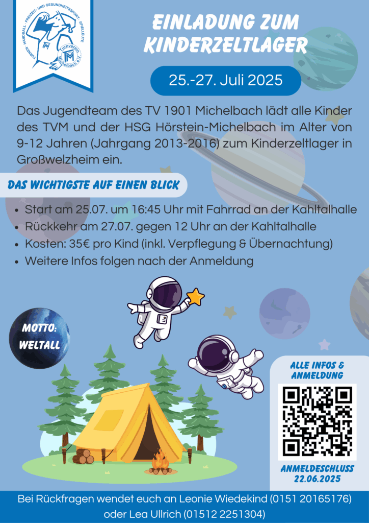 Das Jugendteam des TVM lädt alle Kinder des TV Michelbach und der HSG Hörstein/Michelbach im Alter von 9-12 Jahren zum Kinderzeltlager ein.