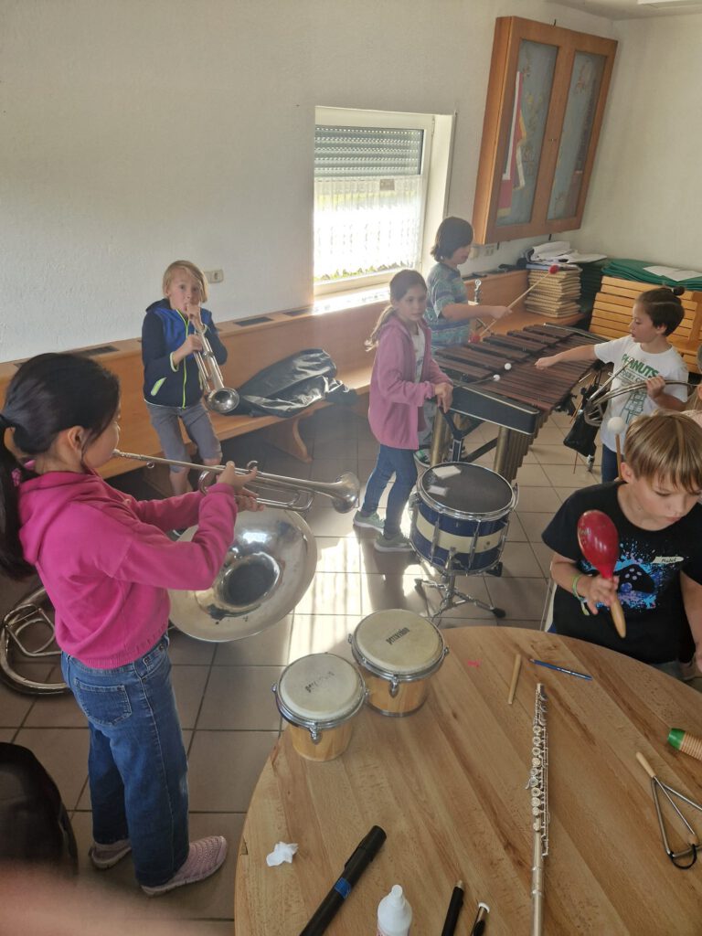 Nach einer kurzen Einführung in die bei uns vorhandenen Instrumente – Flöten, Blechblasinstrumente und Rhythmik – hatten die Kinder die Möglichkeit sich daran auszuprobieren. Dies geschah im Rahmen einer Raterunde, welches Instrument gerade gespielt wird. Dabei wurden auch einige neue Talente entdeckt. Ebenso stellten die Kinder ihre Fähigkeiten über die gerade gelernten Instrumente im Rahmen eines Instrumentenmemorys unter Beweis.