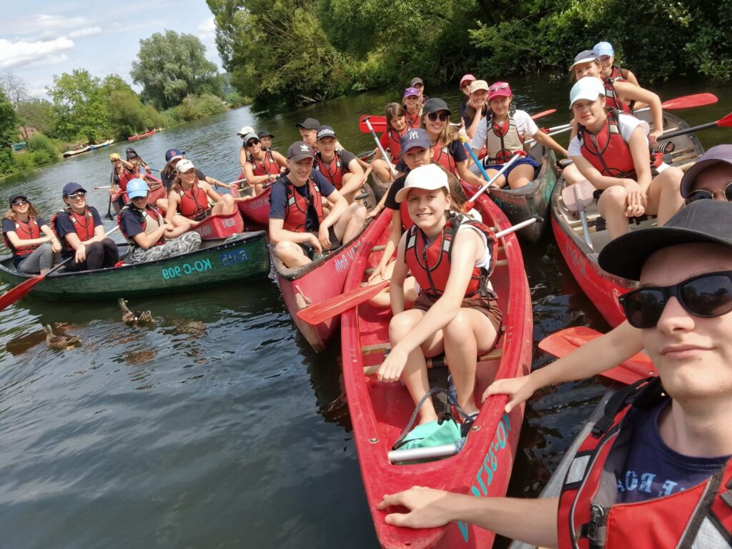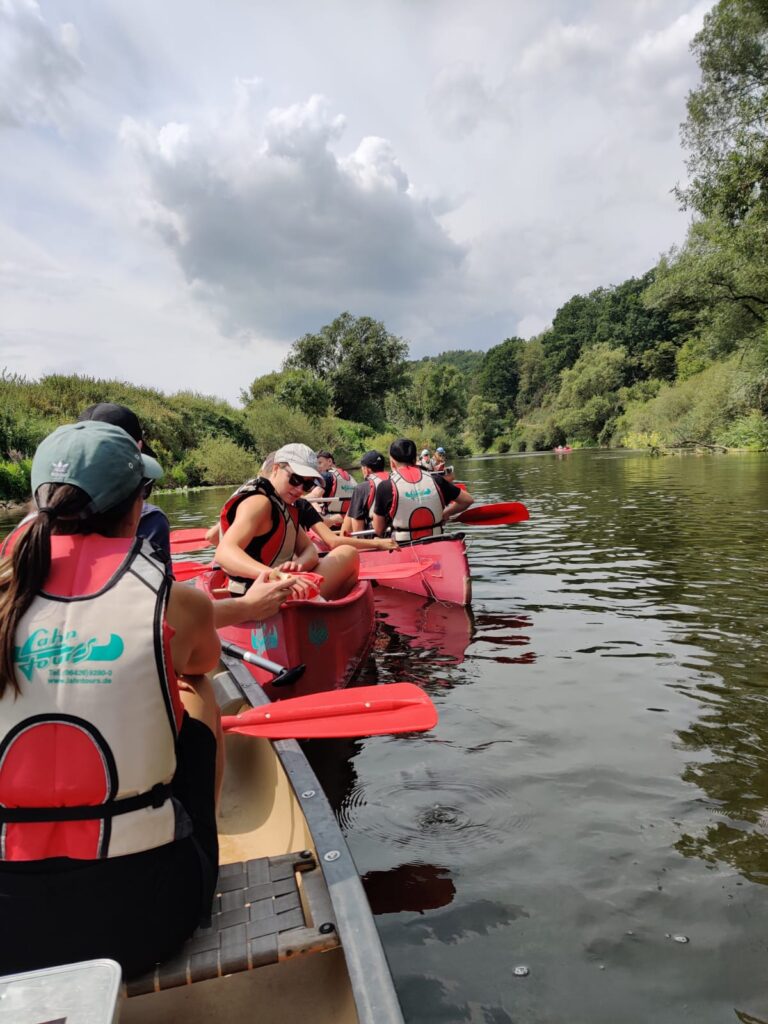 Auch dieses Jahr fand wieder eine Kanutour für alle 13-18-Jährigen statt, die wie letztes Jahr als Tagesausflug durchgeführt wurde. Mit insgesamt 32 Teilnehmenden ging es dann am 22.07. um 8.30 Uhr los Richtung Solms-Schohleck, dem Startpunkt unserer Paddelstrecke. Jedoch gab es schon unterwegs die ersten Schwierigkeiten zu meistern. Doch auch trotz vermeintlichem Motorschaden auf der Autobahn kamen alle Autos pünktlich zur Einweisung an. Fertig ausgestattet mit Schwimmwesten, Getränken und genügend zu Essen ging es dann auch schon los auf die Lahn: Bei manchen schneller, Andere lernten das Gebüsch etwas genauer aus der Nähe kennen. Doch schlussendlich kamen alle an unserem Zwischenstopp an, wo wir uns eine Stärkung wirklich verdient hatten. Von belegten Brötchen und Gemüsesticks bis hin zu Kuchen, es war für jeden etwas dabei. Einige gingen auch noch baden, um sich auf die anstehenden Wasserschlachten vorzubereiten. Diese kamen nämlich nach der Pause vermehrt auf viele Kanus zu, ob freiwillig oder eher unfreiwillig. Auch das Schleusen klappte mit links, sodass wir kurze Zeit später alle gut an unserer Ausstiegsstelle ankamen. Gegen 17:30 Uhr traten wir dann wieder unsere Heimreise an. Angekommen am TVM-Heim gab es dann abschließend noch Pizza. So wurde ein gelungener Tag abgerundet.
