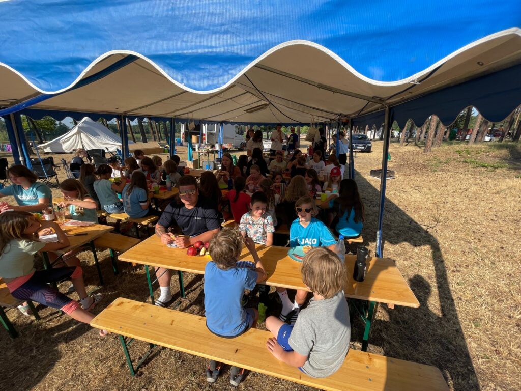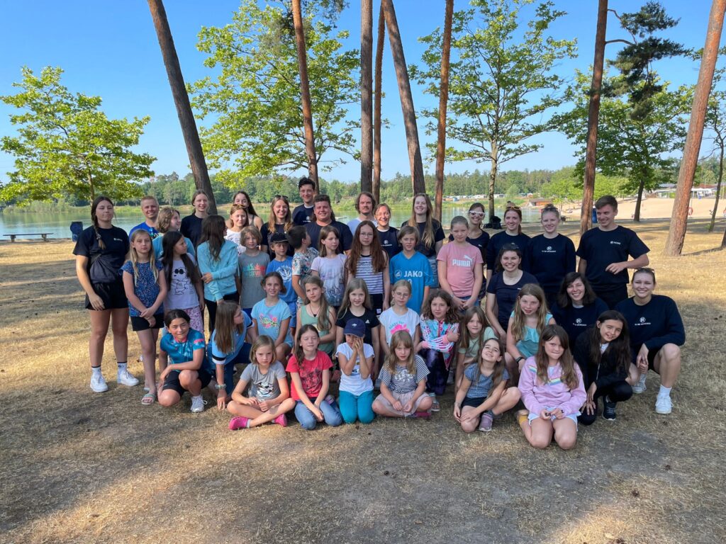Nach 5 Jahren ohne richtiges Kinderzeltlager konnten wir dieses Jahr endlich wieder voll durchstarten. So ging es am Freitag den 23.06. für 30 Kinder und 7 Betreuer mit dem Fahrrad Richtung Campingsee Großwelzheim. Nach einer knappen Stunde Fahrt kamen wir mit großem Hunger und Durst am Zeltplatz an. Aber zuerst mussten die Zelte, die schon von den restlichen Betreuern aufgebaut worden waren, bezogen werden. Nach der Stärkung mit Hamburgern wurden noch ein paar Kennenlernspiele gespielt, bevor es zu einer sehr kurzen Nacht in die Zelte ging. Um 4.30 Uhr waren die ersten Kids nämlich schon wieder wach und bereit für den Tag. Um 6.30 Uhr haben sich dann die ersten Betreuer aus den Schlafsäcken bewegt, um mit den Kindern abseits der Zelte zu spielen. So bekam der Rest der Betreuer noch etwas Schlaf, denn es stand ein Tag voller Herausforderungen für alle an. Zum ersten Mal seit ewiger Zeit war die Sommerrunde der Handballjugend noch nicht nach Pfingsten beendet und so musste die Hälfte der Kinder zwischendurch weg, um Handball zu spielen. Das war für die Planung natürlich eine große Aufgabe, sollten doch möglichst alle Kinder die Programmpunkte Schatzsuche und Olympiade zum Motto „Unten im Meer“ und das Baden im See miterleben können. Im Großen und Ganzen hat es aber gut geklappt und alle hatten ihren Spaß vor allem im kühlen Nass. Aber auch die Schatzsuche, bei der die Einzelteile einer zerstückelten Schatzkarte an verschiedenen Stationen, wie zum Beispiel einem „Wer bin ich“-Spiel oder eine Runde Angeln, gesucht werden mussten und die Olympiade mit Spielen wie Wasserbombentransport oder Flossenhindernislauf waren Highlights. Am Sonntag ging es dann mit den Rädern zurück zur Kahltalhalle, wo die Eltern schon warteten.