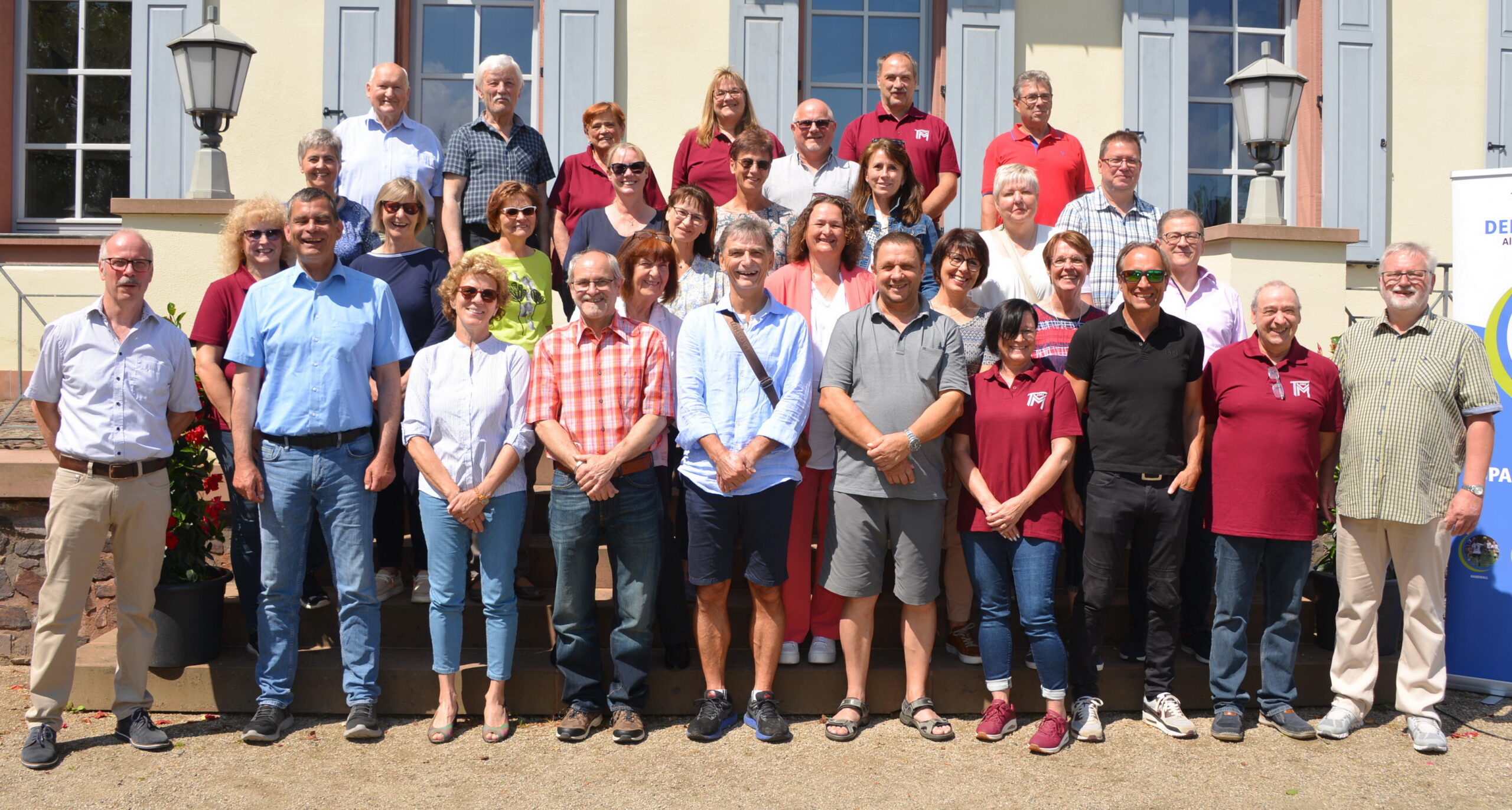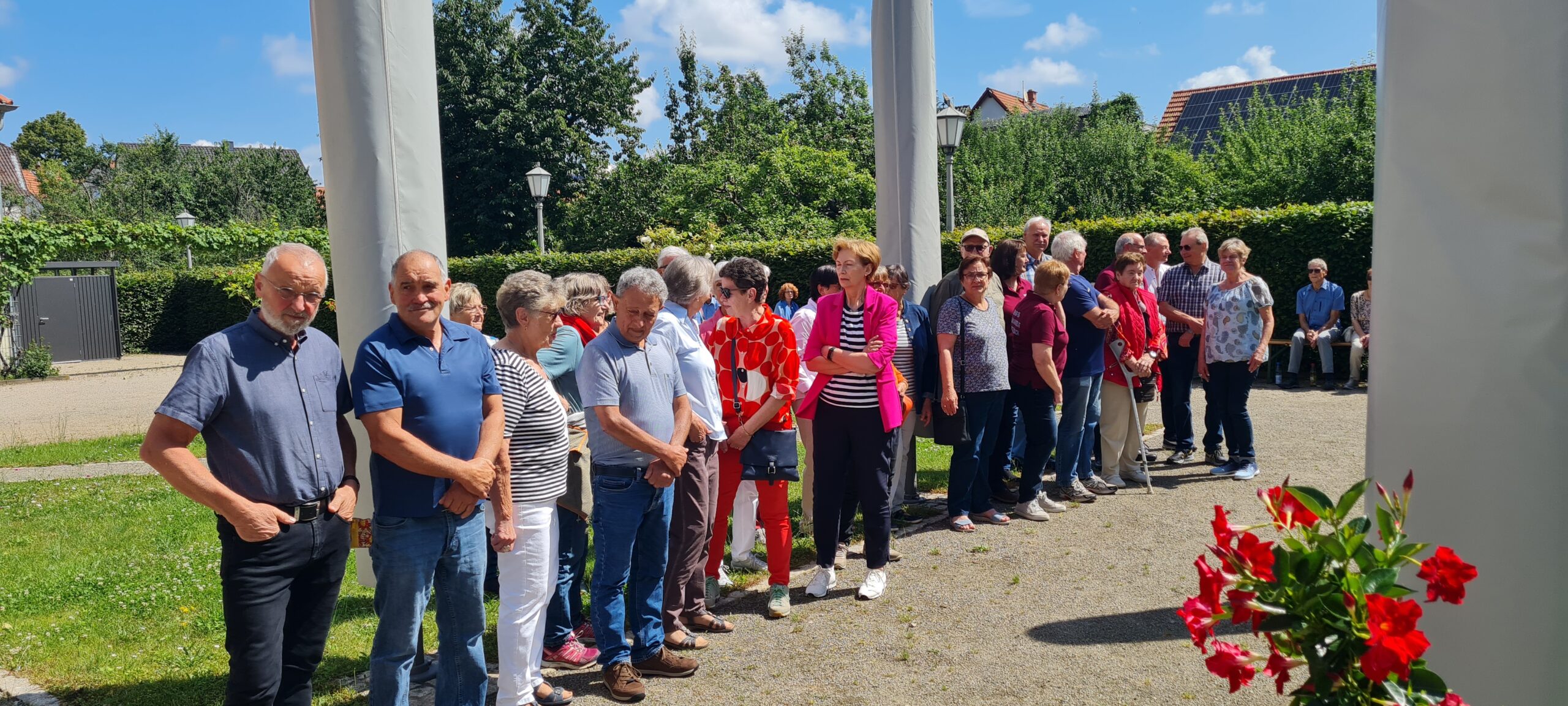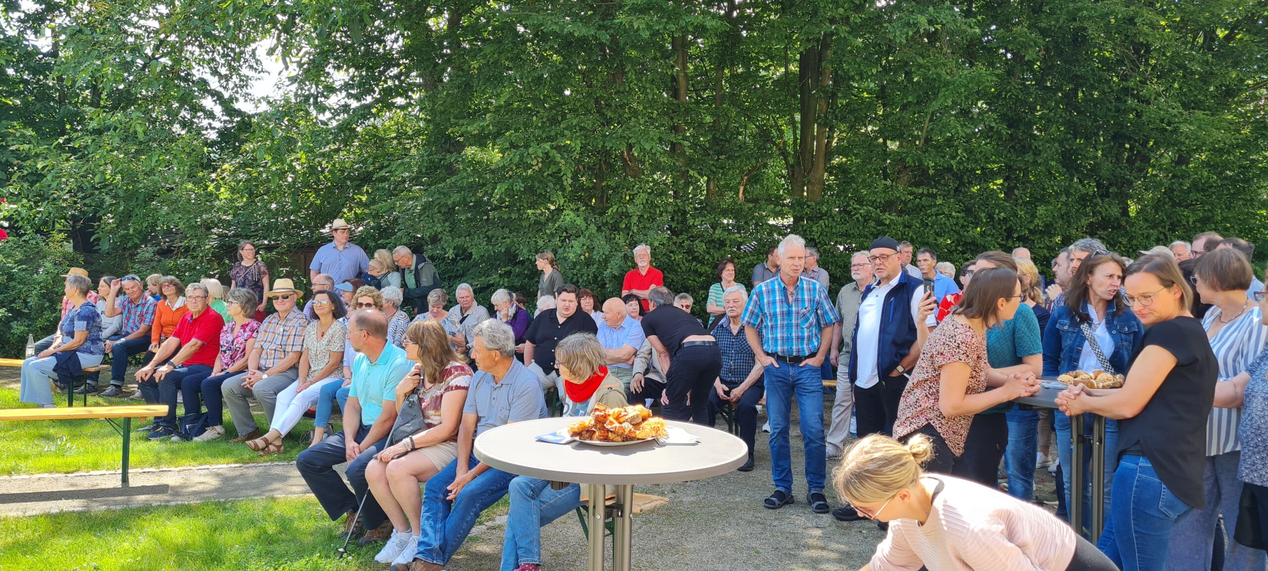 Damit wurde in den Rosengarten im Schlösschen geladen: eine Matinee mit ein paar Getränken, ein paar Snacks, Umrahmung durch den Senioren Spielmannszug und endlich trockenes Wetter. Die Ehrung erfolgt in Gruppen der jeweiligen Jahre der Zugehörigkeit und das Format hat allen Anwesenden viel Vergnügen bereitet, weil es fast wie ein Klassentreffen der geladenen Sportler und Musiker verlief.