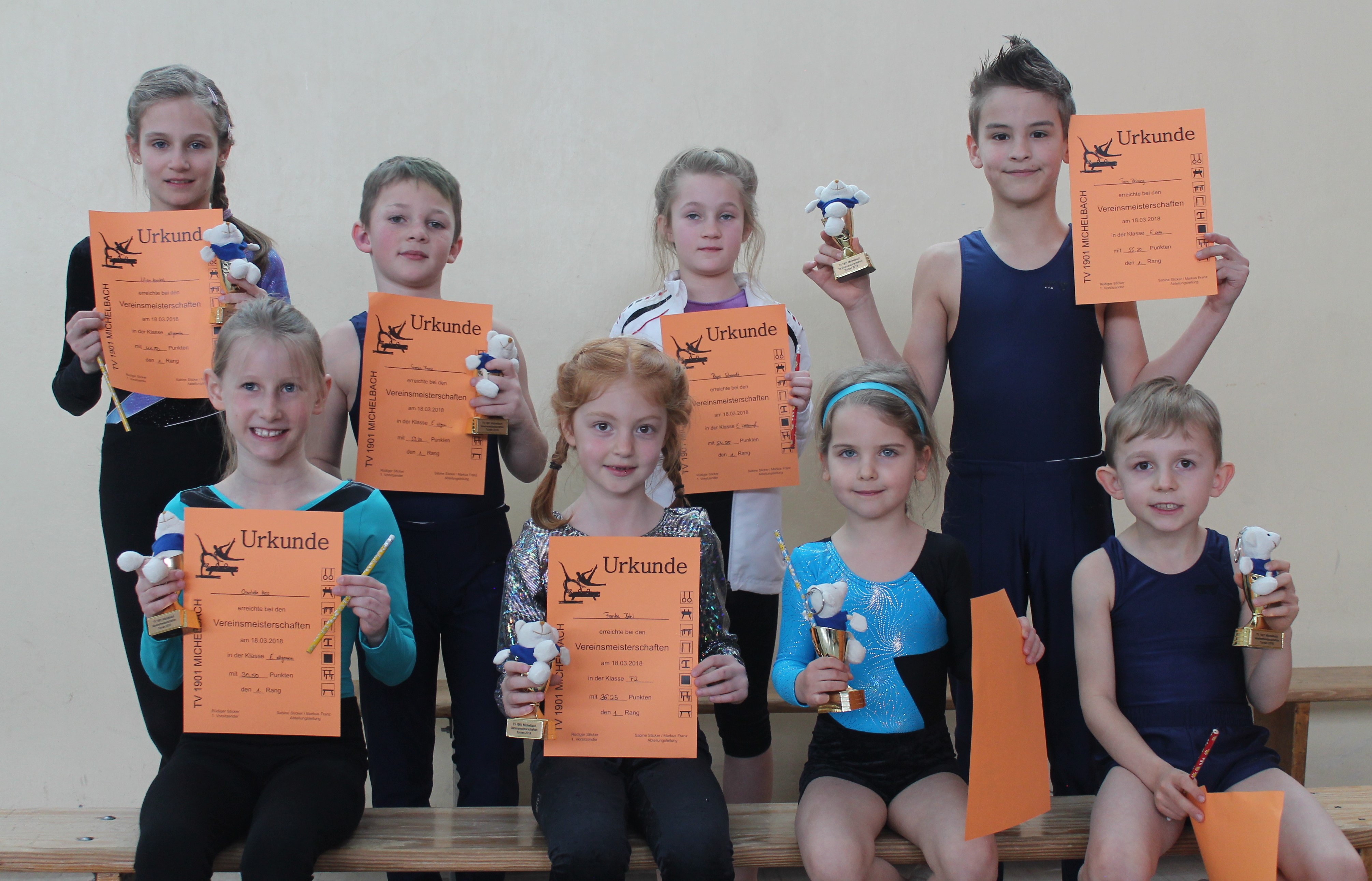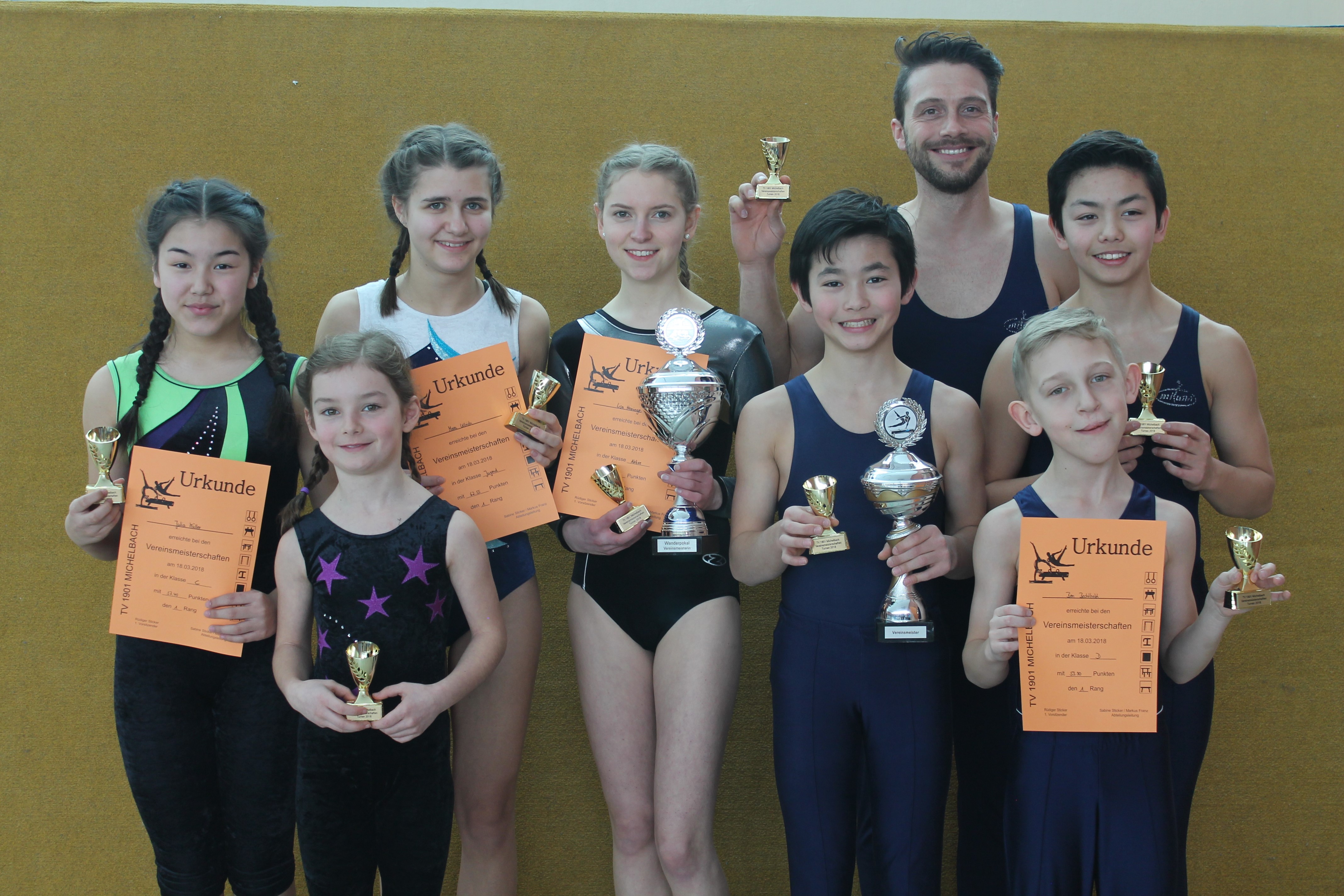 Am Sonntag, 18. März 2018, veranstaltete die Abteilung Turnen wieder die alljährlichen Vereinsmeisterschaften im Geräteturnen in der Schulturnhalle Michelbach. Dafür kamen dieses Jahr 90 motivierte Turnerinnen und Turner in 16 Altersstufen zusammen, um ihr Können zu beweisen. Durch die tatkräftige Unterstützung der Eltern, Trainer, Kampfrichter und jugendlicher Helferinnen konnte der Wettkampf auch diesmal wieder reibungslos ablaufen. Der Zuschauerzuspruch war sehr gut, vor allem nachmittags, als die jüngeren Turnerinnen und Turner antraten. Die Siegerehrung am Nachmittag wurde in bewährter Weise vom Spielleuteorchester umrahmt. Alle Teilnehmer erhielten eine Urkunde, die ersten drei zusätzlich einen Pokal und die Vereinsmeister noch ein kleines Sachgeschenk. Den Wanderpokal für den besten Sechskampf bei den Männern erturnte sich Silas Burow (1. Mal). Bei den Turnerinnen gewann Lisa Heininger den Wanderpokal für den besten Vierkampf (2. Mal).